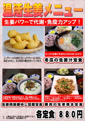 今日の最高気温の予想は23℃と12月並の気温になるようですね。そんな日は当店の生姜メニューで身体の中からポカポカ温まってくださいませ~。
