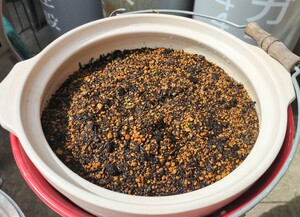 冬のきりたんぽ鍋コースで使っていた土鍋にひびが入ってしまい、使えなくなったので、底に水はけ穴を開けて植木鉢にしました(笑)