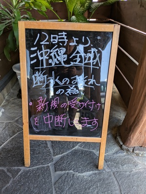 午前10時30の沖縄県からの発表により、県内全域で断水の恐れがあるため、ただ今、新規のお客さまの受け付けを中断しております。
