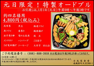 当店ではただ今、「元日限定!特製オードブル」(約4名様用の4800円)のご予約の承っております。限定数に達し次第、受付けを終了いたしますので、お早めにご予約くださいませ。